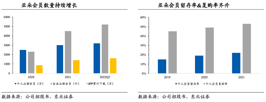 經(jīng)典案例:根據(jù)公司招股書、東北證券等綜合資訊表明,亞朵通過 A-Card 會員計劃培養(yǎng)客戶忠誠度和粘性,會員基數(shù)快速增長,2016-2021年個人會員復(fù)合增速為 48.7%,30 歲以下注冊會員復(fù)合增速為83.9%,截至 2022Q2 公司注冊個人會員數(shù)達 3200 萬。2019-2021 年公司會員留存率分別為 14.8%/19.4%/21.7%,復(fù)購率分別為44.6%/48.7%/52.8%,會員黏性持續(xù)提升, 打造私域流量蓄水池。