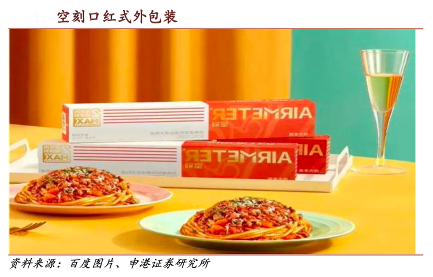 經典案例:根據百度圖片、申港證券研究所等綜合資訊表明,空刻意面考慮到目標用戶大部分是女性,大膽地選擇將包裝設計成化妝品風格。顏色明亮的色塊、代表意面的抽象條紋,加上醒目的 Logo,這個靈感取自于口紅的包裝,形成了獨一無二的“空刻風”。此外,空刻意面創新設計了抽屜盒子的包裝,增加消費者使用過程中的儀式感和驚喜感。