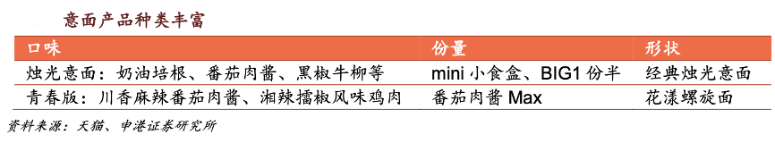 經典案例:根據天貓、申港證券研究所等綜合資訊表明,空刻持續在研發端發力,圍繞“意面”做系列化產品,包括口味的創新和意面形 狀的變化,以期滿足各類潛在客戶的需求。如空刻于2022年推出新品 mini 小食盒, 主打小餓小饞無負擔,開拓了宵夜新場景,并打造空刻意面青春版系列,將川湘兩地標志性辣味與意大利面進行融合創新。
