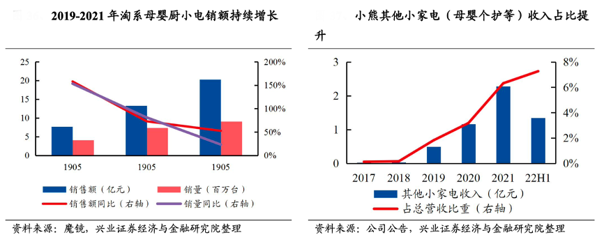 經典案例:根據魔鏡、公司公告、興業證券經濟與金融研究院等綜合資訊表明,2019-2021 年母嬰廚房小家電品類淘系銷額分別同比 +157.9%/+72.8%/+52.5%,銷量分別同比+153.3%/+81.0%/+23.2%。小熊公司萌系品牌定位及高性價比產品與母嬰用品的使用體驗要求及快速迭代較為契合,公司其他小家電(主要為母嬰及個護品類)營收占比逐年提升,2021 年末成立母嬰事業部,個護事業部組織升級,制度化保證新品類持續投入。