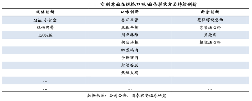 經(jīng)典案例:根據(jù)公司公告、國泰君安證券研究等綜合資訊表明,空刻意面在規(guī)格/口味/面條形狀方面持續(xù)創(chuàng)新。