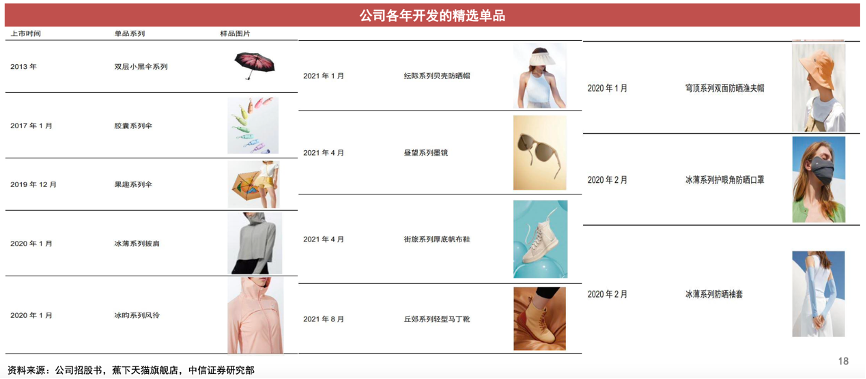 經(jīng)典案例:根據(jù)公司招股書(shū)、蕉下天貓旗艦店、中信證券研究部等綜合資訊表明,蕉下打造爆款防曬傘成功入圍,產(chǎn)品設(shè)計(jì)直擊消費(fèi)者痛點(diǎn)。公司開(kāi)發(fā)的傘具富有“高顏值、科技感拉滿(mǎn)、隨身攜帶”等特征,截至2022年4月,公司有22款精選單品年銷(xiāo)售額超過(guò)3000萬(wàn)元。