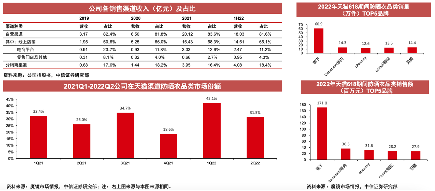經(jīng)典案例:根據(jù)公司招股書(shū)、魔鏡市場(chǎng)情報(bào)、中信證券研究部等綜合資訊表明,蕉下電商起盤(pán),線上渠道表現(xiàn)優(yōu)異,公司攜手頭部主播直播帶貨刺激消費(fèi)(僅2021年618期間李佳琦直播間14次)。根據(jù)魔鏡市場(chǎng)情報(bào)數(shù)據(jù),公司在2022年618期間(2022年6月1日-6月20日)防曬衣品類(lèi)累計(jì)銷(xiāo)量達(dá)60.9萬(wàn)件,銷(xiāo)售額達(dá)1.71億元,領(lǐng)先第二名約4倍。