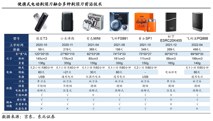 經典創新案例:根據京東、東北證券等綜合資訊表明,電動剃須刀的常規升級包括干濕雙剃、旋轉式電機、多刀頭等,而便攜式在兼容常規升級后,進一步在外觀上開拓 出圓柱形、方形、飛碟形等不同結構,其輕巧的體積和新穎的外形使其在中低價格 帶更加流行。根據奧維云網數據推算,2022 年 6 月便攜式剃須刀線上均價較 2021 年 1 月時提升約 36%至 145 元。