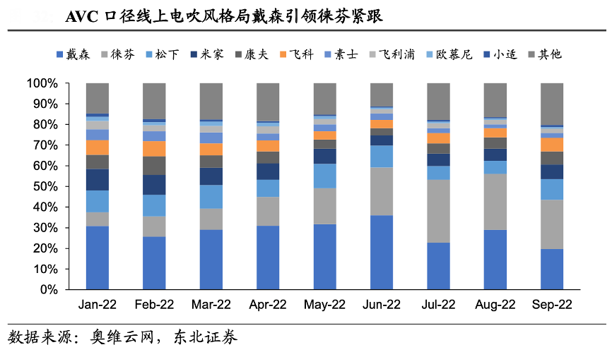 經典創新案例:根據奧維云網、東北證券等綜合資訊表明,隨著徠芬 等新興品牌以及飛科等老國牌在高速電吹風的布局,更合適的價位段使戴森所處的高價格帶占比下降,戴森市占率隨之下滑。根據奧維云網數據,2022 年前三季度線 上電吹風銷額 CR3 為 57.4%,其中戴森/徠芬/松下分別占比 29%/18.7%/9.7%。