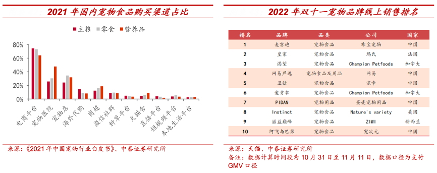 經(jīng)典案例:根據(jù)《2021年中國寵物行業(yè)白皮書》、天貓、中泰證券研究所等綜合資訊表明,伴隨電商行業(yè)的快速發(fā)展,線上渠道成為國內(nèi)寵物食品發(fā)展的重要平臺,根據(jù)《2021 年中國寵物行業(yè)白皮書》,2021年寵物食品購買渠道中,電商占比超過70%,國產(chǎn)品牌相較海外企業(yè)對國內(nèi)消費(fèi)者的感知力更強(qiáng)。
