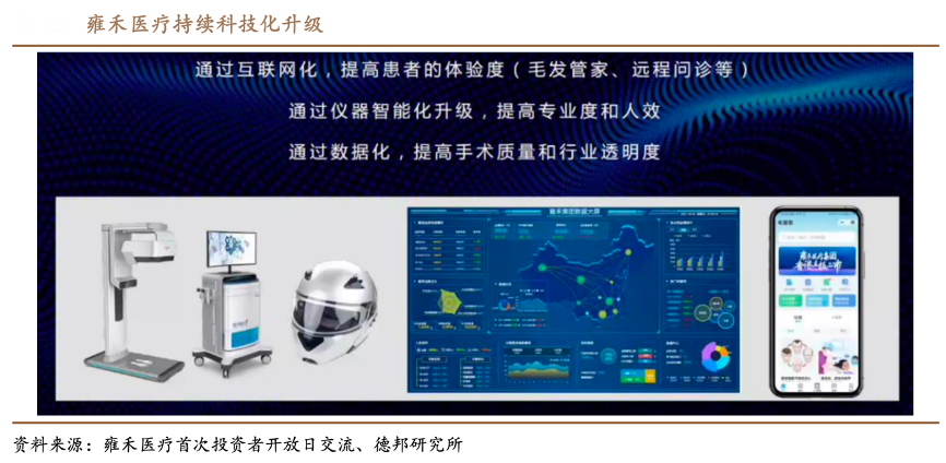 經典案例:根據雍禾醫療首次投資者開放日交流、德邦研究所等綜合資訊表明,雍禾是首家建立數據分析系統的民營毛發服務提供商,且是截止目前唯一一家可實時獲取患者人數、植發手術數量及毛囊移植數量資料的連鎖醫療機構。數據展示提升了醫療服務的透明度,進而提升患者治療體驗。