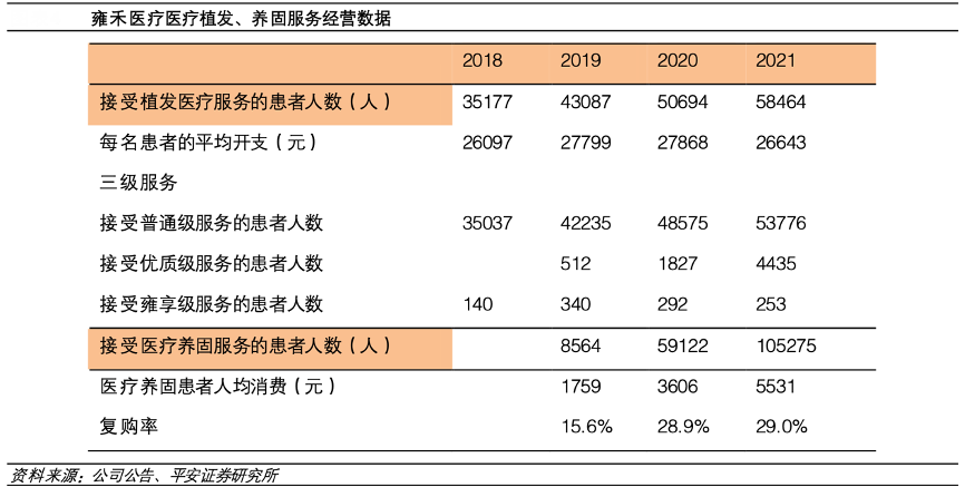 經(jīng)典案例:根據(jù)公司公告、平安證券研究所等綜合資訊表明,通過全產(chǎn)業(yè)鏈的服務(wù)體系以及醫(yī)護(hù)人員服務(wù)能力的提升,雍禾醫(yī)療的患者人數(shù)不斷增加。接受植發(fā)醫(yī)療服務(wù)的患者人數(shù)從 2018 年 35177 人增長至 2021 年 58464 人,3 年的復(fù)合增長率為 18.45%;接受醫(yī)療養(yǎng)固服務(wù)的患者人數(shù)從 2019 年的 8564 人增長至 2021 年的 105275 人,復(fù)合增速達(dá)到 250.61%。