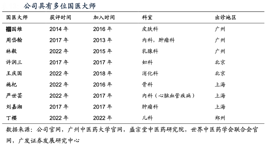 經典案例:根據公司官網、廣州中醫藥大學官網、盛宗堂中醫藥研究院、世界中醫藥學會聯合會官網、廣發證券發展研究中心等綜合資訊表明,“中醫看人”,多位國醫大師、國家級和省市級名中醫坐鎮固生堂,為固生堂集團提供可 靠背書,樹立品牌打響知名度。截至2022年12月31日,固生堂在全國共擁有9名多點執業的國醫大師,數量排名第一。
