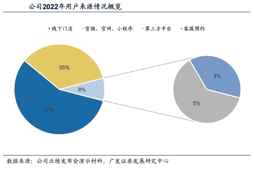 經典案例:根據公司業績發布會演示材料、廣發證券發展研究中心等綜合資訊表明,固生堂2022年來自官微及小程序的用戶比例占35%,對于年輕一代,他們的消費習慣更傾向于使用線上線下相結合的模式,以節約時間成本,因此OMO模式的不斷優化將進一步鞏固公司的主力消費群體。