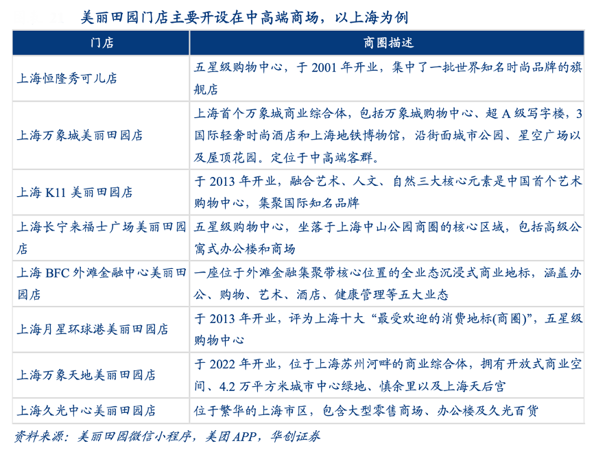 經典案例:根據美麗田園微信小程序、美團APP、華創證券等綜合資訊表明,美麗田園布局中高端商場,定位中高端客戶,以上海為例,美麗田園在恒隆廣場、萬象城、K11、BFC 外灘金融中心、久光中心等高端商場均有布局,基于此,美麗田園 ASP 較高,2022 年為 943 元。