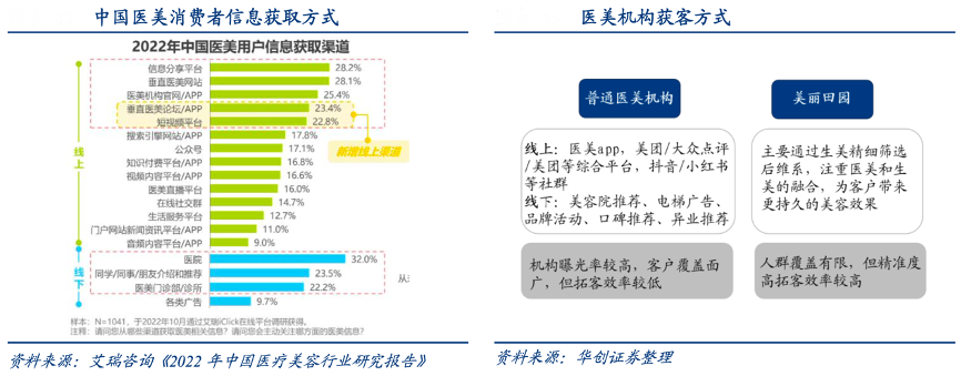 經典案例:根據艾瑞咨詢、華創證券等綜合資訊表明,美麗田園一般求美者獲取信息的途徑包括:1)線上的社媒平臺、垂直醫美網站/APP、醫美機構網 站等,2)線下的醫院/門診部/診所,親朋好友的推薦,各類廣告。公司深耕生美 30 年, 年約服務近 30 萬消費者,擁有超 10 萬的活躍會員(2022 年直營 7.6 萬+加盟店 3.0 萬, 合計 10.6 萬),生美活躍會員年均到店次數約為 10 次,與生美會員之間建立起了高強度的信任和情感價值,雖獲客覆蓋范圍有限但更為精準。