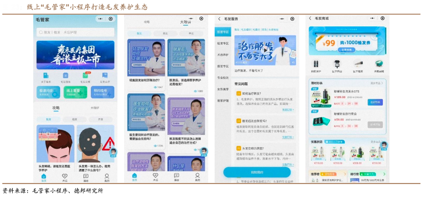 經典案例:根據毛管家小程序、德邦研究所等綜合資訊表明,雍禾醫療公司積極推進在線醫療服務,已建立一支在線醫療團隊,在微信小程序上開發“毛管家”小程序,擁有超 81 萬名注冊用戶,可為患者進行植發手術介紹、查詢醫生執照及價格信息等,可實時上傳患者病歷等文件。