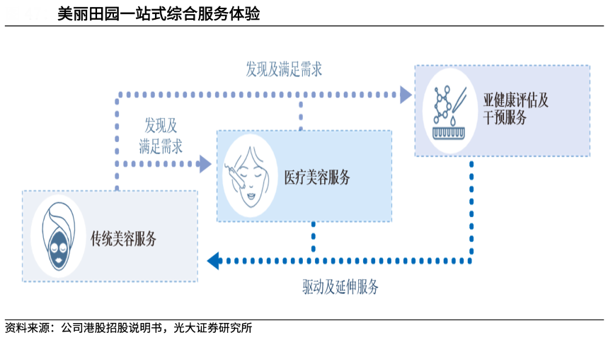 經典案例:根據公司公告、光大證券研究所等綜合資訊表明,美麗田園以“雙美”模式打造流量閉環,私域轉介降低銷售費用。其通過傳統美容服務初步贏得客戶信任,進而延伸至醫療美容服務以及亞健康評估及干預服務等服務, 多元化服務涵蓋 47 類服務項目及超過 800 個 SKU,陪伴客戶的成長。