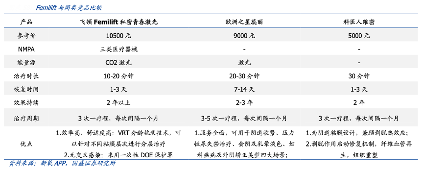 經典案例:根據新氧APP、國盛證券研究所等綜合資訊表明,復銳醫(yī)療科技公司微創(chuàng)美容市場產品覆蓋多個領域,具體包括女性私密美容、抽脂、靜脈曲張治療。產品包括 FemiLift、BeautiFill by LipoLife 和 VascuLife。FemiLift 產品運用 CO2 激光進行女性私密健康修復治療,針對包括應激性尿失禁、私密美容治療、產后修復、更年期后泌尿道綜合癥等問題。