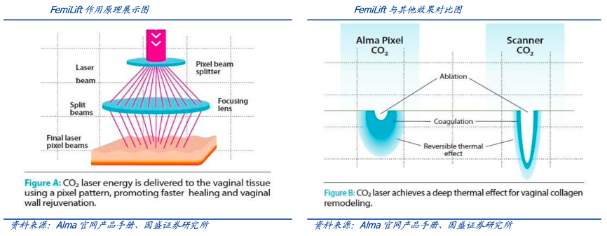 經典案例:根據Alma官網產品手冊、國盛證券研究所等綜合資訊表明,FemiLift 聚焦女性私密美容,通過獨特的長波脈沖,并利用 CO2 點陣激光來實現傳遞更高的能量。與同類產品相比,Femilift 由于獨有的 VRT 技術,具備治療效率高、舒適度高等優(yōu)點,單次治療 時長通常僅需 15min,且由于療程采用一次性 DOE 保護罩,無交叉感染風險。