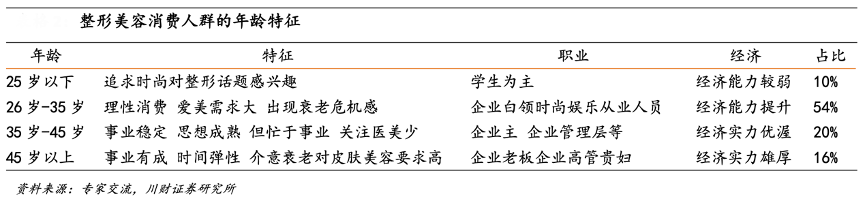 經(jīng)典案例:根據(jù)專家交流、川財證券研究所等綜合資訊表明,26—35 歲因為有經(jīng)濟基礎,對個人的生活品質要求在逐漸提高,這類人群對美容整形的需求最大,可以達到 54%,整形美容行業(yè)出現(xiàn)年輕化趨勢;另外就是 35—40 歲這個群體,因為事業(yè)穩(wěn)定,思想比較成熟,但是年齡的壓力促使這個群體對美容行業(yè)的需求非常旺盛。