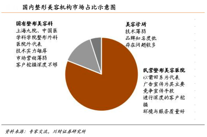 經(jīng)典案例:根據(jù)專家交流、東莞證券研究所等綜合資訊表明,整形美容主要是 以民營整形美容醫(yī)院為主,其中以莆田系為代表,由于廣告宣傳推銷到位,目前民營業(yè)績占據(jù)80%以上的市場份額;國有整形美容科因為技術實力雄厚,但是因為服務質量差、市場營銷薄弱和客戶挖掘深度不夠導致市場占有率不足 15%。