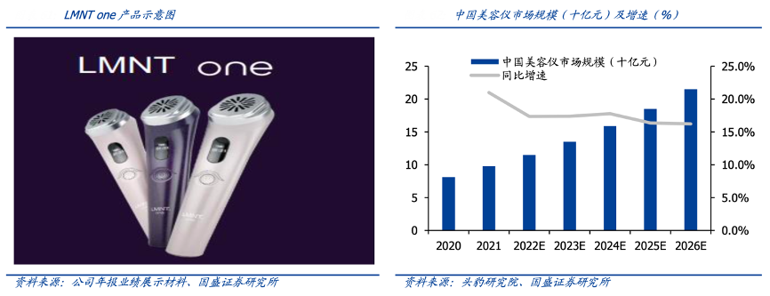經典案例:根據頭豹研究院、公司年報業績展示材料、國盛證券研究所等綜合資訊表明,復銳醫療科技公司于2022 年 3 月 2 日推出全新品牌 LMNT,隨后推出首款家用 美容儀器 LMNT One。LMNT One基于紅光和紅外光療法,結合兩種獨特激光波長 NIR 830nm 和 630nm 的功率,利用協調微脈沖實現嫩膚、提升皮膚彈性和促進膠原蛋白再生等效果。