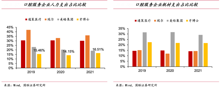 經典案例:根據wind、國聯證券研究所等綜合資訊表明,通過對比可以發現, 大部分口腔連鎖企業人力成本和耗材成本占比接近半數,但不同的企業成本結構相差較大,其中瑞爾集團人力支出占比明顯高于其他公司,美皓集團耗材占比明顯高于其他公司(種植牙收入占比較高)。