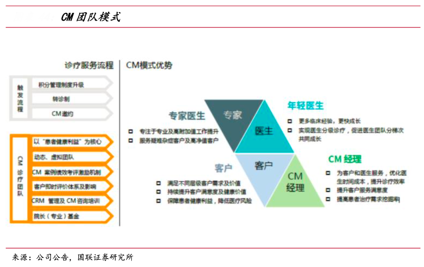 經典案例:根據公司公告、國聯證券研究所等綜合資訊表明,通策醫療CM 團隊診療模式診療團隊是常規診療團隊的升級,當客戶達到些許條件(比如客戶累計積分達標)時升級為由 CM 團隊提供服務。CM 團隊由主診醫生、駐院醫生、醫助、護士和客服人員構成,對客戶實施分類管理和服務。此舉將更加精準地為不同客戶提供合適的服務,同時 CM 團隊接診模 式可以讓醫生專注做專業和高附加值的工作。