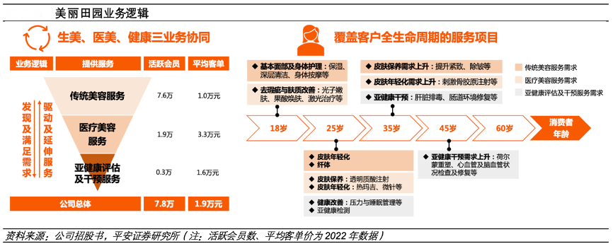 經(jīng)典案例:根據(jù)公司招股書(shū)、平安證券研究所等綜合資訊表明,美麗田園構(gòu)建生美+醫(yī)美+健康服務(wù)體系,項(xiàng)目覆蓋客戶全生命周期。公司服務(wù)定位中高端,生美服務(wù)是公司基本盤,通過(guò)高頻的生美服務(wù),公司與客戶建立深度溝通與信任,發(fā)現(xiàn)美麗和健康的更高階需求,進(jìn)而延伸出醫(yī)美與健康管理業(yè)務(wù)。截止目前,公司提供約 47 類美麗與健康服務(wù),生美、醫(yī)美、健康服務(wù) SKU 總數(shù)超 800 個(gè),并且覆蓋客戶全生命周期。