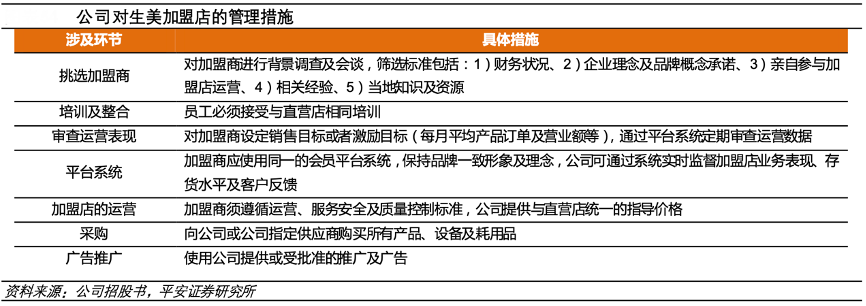 經(jīng)典案例:根據(jù)公司招股書(shū)、平安證券研究所等綜合資訊表明,美麗田園公司僅生美業(yè)務(wù)開(kāi)放高門檻加盟,其對(duì)加盟商管控嚴(yán)格,要求加盟商嚴(yán)格保持品牌統(tǒng)一形象、使用公司統(tǒng)一的會(huì)員平臺(tái)系統(tǒng)、僅可向公司購(gòu)買產(chǎn)品與設(shè)備、與直營(yíng)店統(tǒng)一的價(jià)格指導(dǎo),且所有銷售經(jīng)營(yíng)活動(dòng)進(jìn)入公司 POS 系統(tǒng),公司對(duì)加盟店進(jìn)行定期巡查。公司生美業(yè)務(wù)引入加盟已經(jīng)超過(guò) 15 年,助力加速擴(kuò)展門店網(wǎng)絡(luò)、吸引客戶及區(qū)域滲 透,2022 年公司直營(yíng)+加盟活躍會(huì)員數(shù)達(dá)到 10.82 萬(wàn)人,其中加盟店活躍會(huì)員數(shù) 2.99 萬(wàn)人,占比 28%。