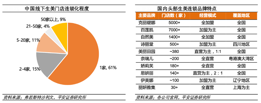 經(jīng)典案例:根據(jù)弗若斯特沙利文、各公司官網(wǎng)、平安證券研究所等綜合資訊表明,在全國 100 多萬家生美門店中,61%的生美門店為單體店,15% 擁有 2-4 家門店,門店數(shù) 5 家及以上的占比 24%,其中 50 家以上連鎖的僅占9%。頭部品牌通過直營或加盟模式擴(kuò)張,其中加盟為主的品牌以產(chǎn)品銷售為核心收入來源,門店作為銷售渠道、數(shù)量眾多,代表性企業(yè)如克麗緹娜(門店數(shù)量 5000+ 家)、自然美(1400+家)。