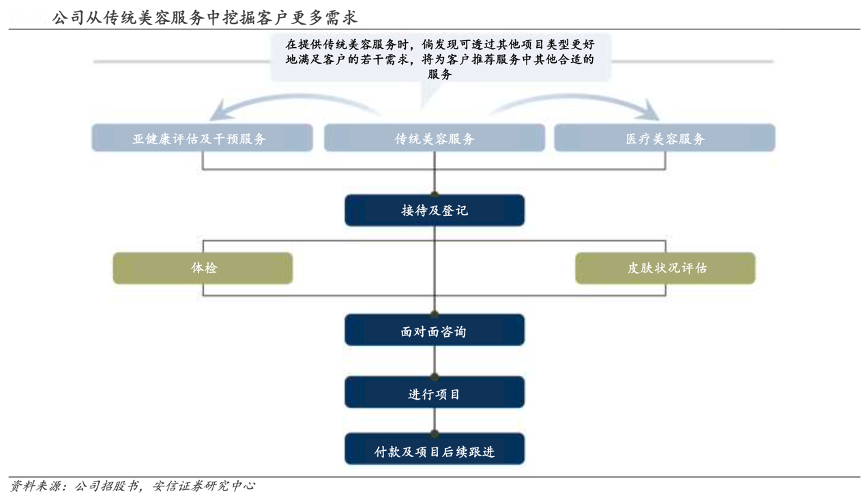 經典案例:根據公司招股書、安信證券研究中心等綜合資訊表明,美麗田園公司通過傳統美容服務初步贏得客戶信任,憑借多年經驗積累挖掘客戶醫美等更復雜的需求。2011年起,公司從傳統美容服務拓展到輕醫美服務,以滿足客戶更高階的美容需求,以此貢 獻第二增長曲線,而后于 2018 年洞察到客戶的亞健康管理需求,成功打造第三增長曲線。