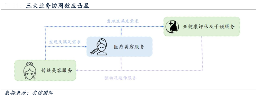 經(jīng)典案例:根據(jù)安信國際等綜合資訊表明,美麗田園公司通過傳統(tǒng)美容服務(wù)獲客,延伸至更復(fù)雜且專業(yè)的醫(yī)療美容服務(wù)以及亞健康評估及干預(yù)服務(wù),發(fā)揮最大協(xié)同效應(yīng),從而提升客戶留存率和提高客戶消費水平。2022 年23.7%的傳 統(tǒng)美容服務(wù)會員購買了醫(yī)療美容服務(wù)或亞健康評估及干預(yù)服務(wù),較 2021 年上漲 2 個百分點。