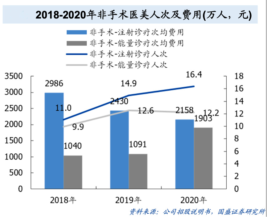經典案例:根據公司招股說明書、國盛證券研究所等綜合資訊表明,伊美爾非手術項目以注射類、能量類為主,診療時間一般為20至60分鐘。從診療人次來看:注射診療人次增速較快,2018-2020年分別為11/14.9/16.4萬人。從次均費用來看,2018-2020年注射診療次均費用呈下降趨勢,分別為2986/2430/2158元,能量診 療次均費用呈上升趨勢,為1040/1091/1903元。