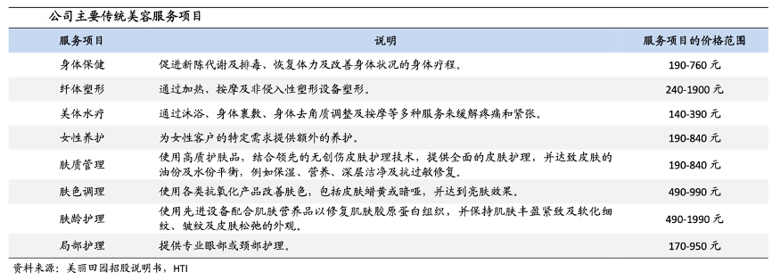 經典案例:根據美麗田園招股說明書、HTI等綜合資訊表明,美麗田園傳統美容服務項目眾多,整體客單價較低。截至 2022 年 12 月 20 日,公司提供 31 種傳統美容服務項目,涵蓋超過 130 個 SKU,包括身體保健、纖體塑形、美體水療、膚質管理、膚色調理等項目,服務項目的價格范圍不超過 2000 元,大部分項目集中在 1000 元以下。