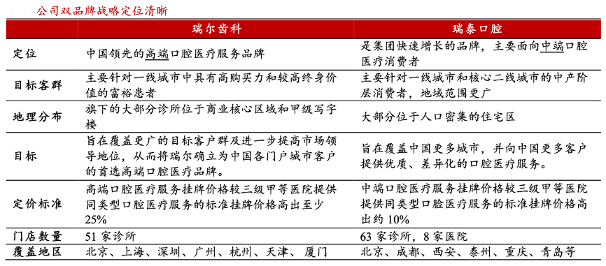 經典案例:根據華西證券等綜合資訊表明,2012年,瑞爾公司推出子公司“瑞泰口腔”,雙品牌戰略著眼于差異化的價值主張,為來自于不同區域與經濟背景的患者提供周到、明確、獨特的口腔醫療服務。在雙品牌戰略推動下,公司迅速布局全國擴張計劃,并快速擴大了患者客群,獲取了兼具豐富性與多樣性的診療范例。