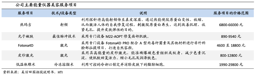 經典案例:根據美麗田園招股說明書、HTI等綜合資訊表明,憑借先進設備及經驗豐富的專業服務人員,美麗田園公司就各種目的提供廣泛的優質能量儀器美容服務,如皮膚 年輕化、色素改善、皮膚緊致、膠原蛋白刺激、提升、皮膚去角質、脫毛及局部脂肪 細胞破壞。能量儀器美容服務涉及使用能量設備,例如激光、射頻、強脈沖光及冷凍 溶脂。所有能量儀器設備均獲國家藥品監督管理局有關其安全性及有效性的批準。