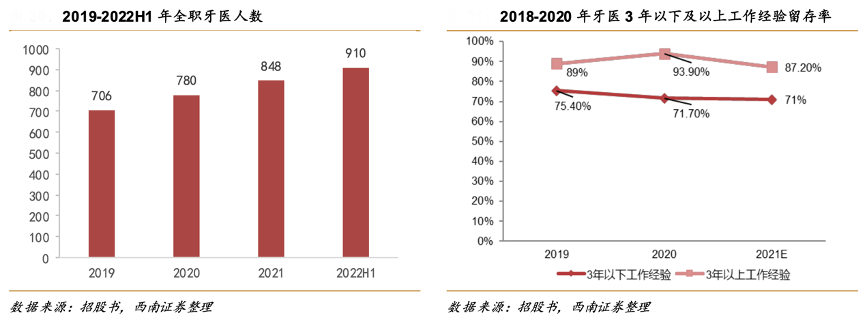 經典案例:根據招股書、西南證券等綜合資訊表明,瑞爾公司通過多種途徑招募牙 醫,包括在中國北京大學口腔醫學院、四川大學華西口腔醫學院和首都醫科大學等一流口腔醫學院進行校園招聘,同時利用橫向招聘,主要自公立醫院聘 請富有才干的牙醫,醫生總人數從 2019 年的 706 人增加至 2022 年 9 月的 910 人。超過 46.8%的全職牙醫擁有碩士或以 上學位,208 名約 23.6%的全職牙醫擁有超過 15 年的牙科從業經驗;132 名或 15.0%的全 職牙醫擁有 10 年至 15 年的牙科從業經驗。全職牙醫團隊平均擁有 10.4 年的行業經驗。