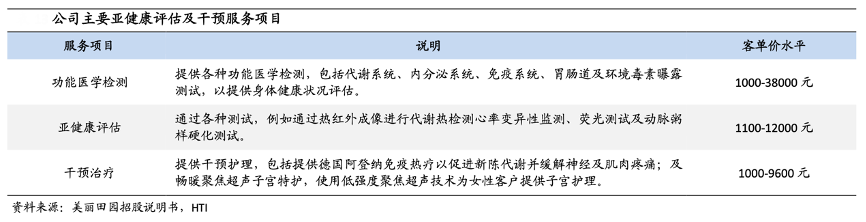 經典案例:根據美麗田園招股說明書、HTI等綜合資訊表明,美麗田園公司于 2018 年開始提供亞健康評估及干預服務,以響應傳統美容服務客戶的需求,于往績記錄期間通 過五家研源醫療中心提供亞健康評估及干預服務。憑借先進技術及醫療設備,亞健康 評估及干預服務旨在就亞健康評估及干預項目,使用專門技術及各類測試以評價健康 狀況并提供干預護理。截至 2022 年 12 月 20 日,公司已提供六類亞健康評估及干預 服務項目,涵蓋近 400 個 SKU。