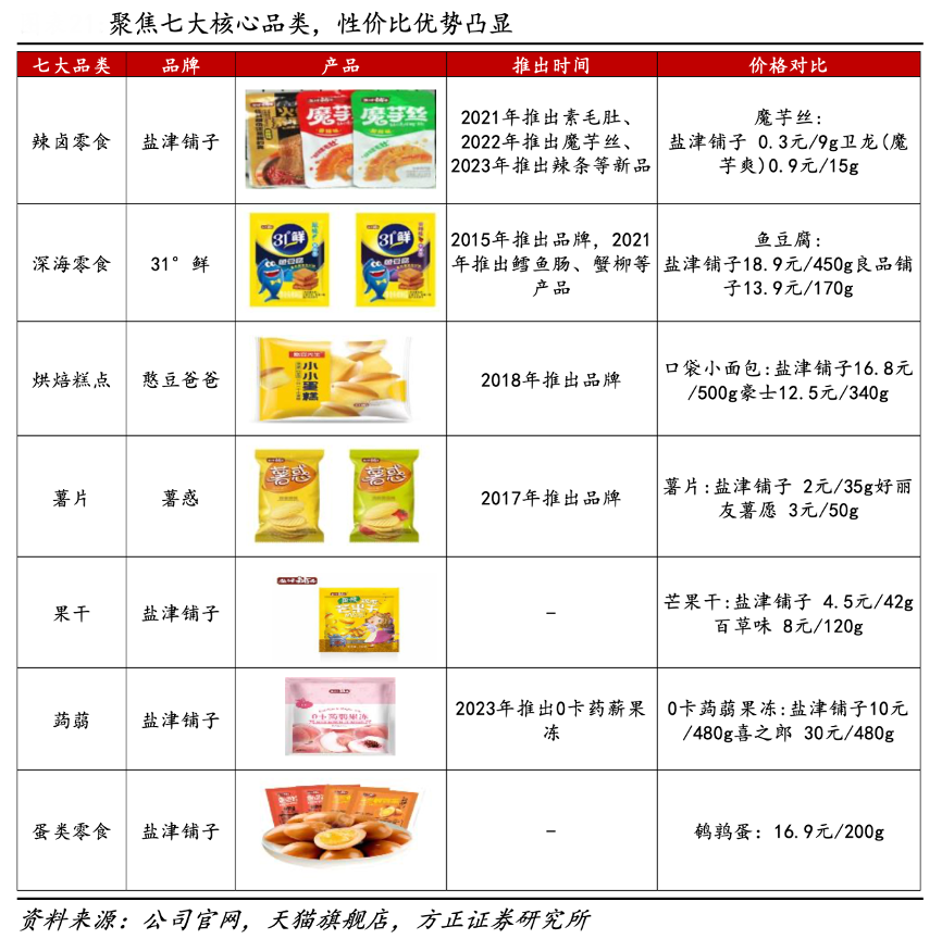 經典案例:根據公司官網、天貓旗艦店、方正證券研究所等綜合資訊表明,鹽津鋪子公司實行多品牌運作,聚焦七大核心品類。自 2021 年按照“多品牌、多品類、全渠道、全產業(yè)鏈、(未來)全球化”中長期戰(zhàn)略發(fā)力以來,公司做大做強“鹽津鋪子”辣鹵零食、“31°鮮”深海零食,“憨豆爸爸”烘焙食品、“薯之惑”焙烤薯片、蛋類零食“蒟蒻滿分”蒟蒻果凍、果干堅果七大核心品類,產品品牌定位“好吃不貴,國民零食”,實現(xiàn)高品質+高性價比的產品。
