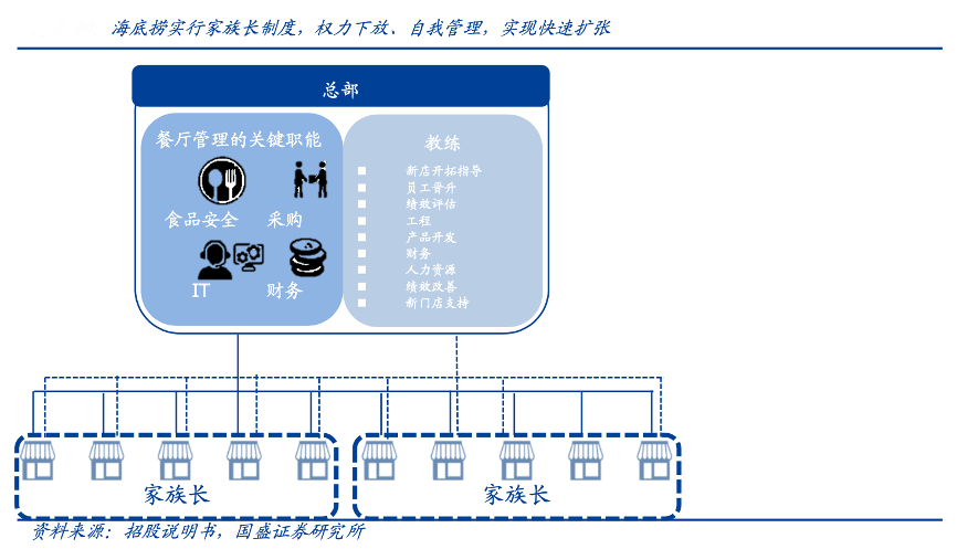 經典案例:根據招股說明書、國盛證券研究所等綜合資訊表明,2016 年,海底撈將大區(qū)和小區(qū)裁撤,進一步下放權力。自此之后,權力下放也成為了海底撈的核心。海底撈在 2016 年 該模式下,權力下放、助力海底撈進入加速發(fā)展階段。步入 2018 年,公司進一步誕生家 族長制度,將同一區(qū)域的 5-18 個門店組成一個抱團小組,設立家族長制度,實現門店與區(qū)域的利益捆綁,家族長對于家族內門店的管理水平和經營績效承擔責任。