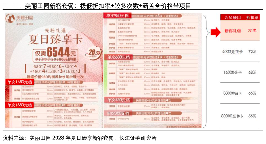 經典案例:根據美麗田園2023年夏日臻享新客套餐、長江證券研究所等綜合資訊表明,以美麗田園新客禮包為例,其涵蓋多次數(26 次)+全 價格帶(單次 380-1680 元項目全覆蓋)項目的同時給予新客 31 折的極低折扣率,甚至 低于會員至尊卡的 55 折最低折扣,盡可能降低新客嘗鮮的資金成本,將消費者注意力 牽引至服務質量和體驗感本身,以此區分出購買力、護膚需求與品牌相符的核心客群。