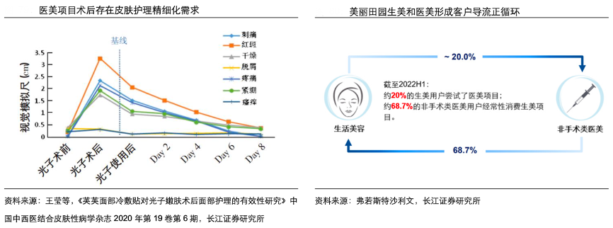 經典案例:根據王瑩等著作、弗若斯特沙利文、長江證券研究所等綜合資訊表明,由于醫美機構以醫護人員為主,難以兼顧術后護理,而醫美術后的皮膚通常更為敏感脆弱,需加大補水力度或采取消炎措施,加之日常在家使用的化妝品溫和性不足而易于刺激皮膚。因此,秀可兒用戶有較大動力回流至生美門店進行術后護理,據美麗田園統計,約 68.7%的秀可兒用戶回流至生美門店,形成正向循環,客戶粘性得以增強。