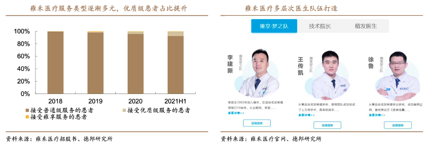 經典案例:根據雍禾醫療首次投資者開放日交流、德邦研究所等綜合資訊表明,雍禾是首家建立數據分析系統的民營毛發服務提供商,且是截止目前唯一一家可實時獲取患者人數、植發手術數量及毛囊移植數量資料的連鎖醫療機構。數據展示提升了醫療服務的透明度,進而提升患者治療體驗;另一方面通過分析運營所收集的數據,公司可迅速準確的發現并滿足患者需求,有效管理客戶情況,實時精準廣告營銷,并對患者的需求做出預測以及告知診斷及治療過程。