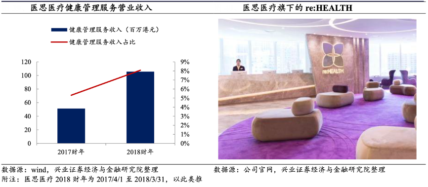 經典案例:根據wind、公司官網、興業證券經濟與金融研究院等綜合資訊表明,當前醫思醫療公司的已覆蓋心胸肺外科、臨床微生物及感染學、臨床腫瘤學、家庭醫學、腸胃肝臟科、外科、老人科、神經外科、矯形外科及創傷學、耳鼻喉科、兒科、整形外科、精神科、放射科、泌尿科、中醫、脊醫和牙醫等。2016 年 5 月公司開設re:HEALTH,提供體檢、健康產品及健康管理服務。re:HEALTH 是香港醫管局授權指定的疫苗接種機構,HPV 疫苗注射數量位于全港第一。