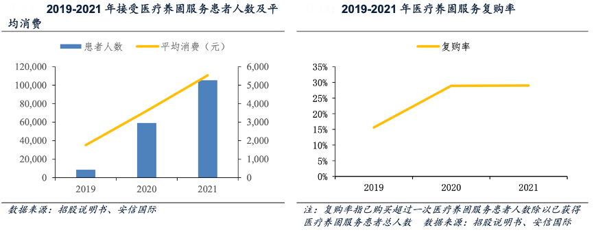 經(jīng)典案例:根據(jù)招股說(shuō)明書、安信國(guó)際等綜合資訊表明,雍禾醫(yī)療公司收購(gòu)英國(guó)健發(fā)品牌史云遜后開(kāi)始進(jìn)軍醫(yī)療養(yǎng)固業(yè)務(wù),經(jīng)過(guò)多年的發(fā)展,協(xié)同效應(yīng)成效顯現(xiàn),2021 年植發(fā)患者手術(shù)后選擇進(jìn)行醫(yī)療養(yǎng)固服務(wù)的轉(zhuǎn)化率為44.6%,醫(yī)療養(yǎng)固服務(wù)后繼續(xù)選擇植發(fā)手術(shù)的轉(zhuǎn)化率為4.1%。因醫(yī)療養(yǎng)固服務(wù)非手術(shù)且更易負(fù)擔(dān),受到越來(lái)越多消費(fèi)者的青睞,接受醫(yī)療養(yǎng)固服務(wù)的患者人數(shù)、人均消費(fèi)、復(fù)購(gòu)率不斷攀升,其中,復(fù)購(gòu)率從 2019 年的 15.6%增長(zhǎng)至 2021 年的 29.0%,說(shuō)明消費(fèi)者粘性不斷提高。