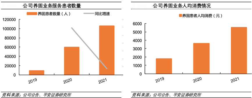 經典案例:根據公司公告、平安證券研究所等綜合資訊表明,2021年雍禾醫療公司養固業務服務患者的數量達到10.5 萬人,增速達到 78%,患者人數快速增長。 同時公司養固業務人均消費不斷增加,2021年為 5531元。