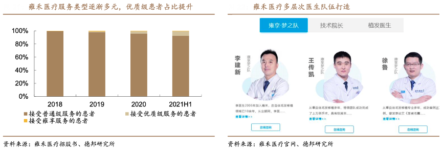 經典案例:根據雍禾醫療招股書、雍禾醫療官網、德邦研究所等綜合資訊表明,雍禾醫療公司提供三級根據醫生經驗及技能加以區分的植發醫療服務,包括:1)普通級服務:針對接 受標準植發手術的患者,收取人民幣 2 萬元至 3 萬元;2)優質級服務:針對院長、主任或副主任進行升級和定制化植發手術的患者,收取 3 萬元至 5 萬元;3)貴賓級雍享服務:針對接受由業內知名植發專家進行個性化植發手術的患者,收取逾 10 萬元。