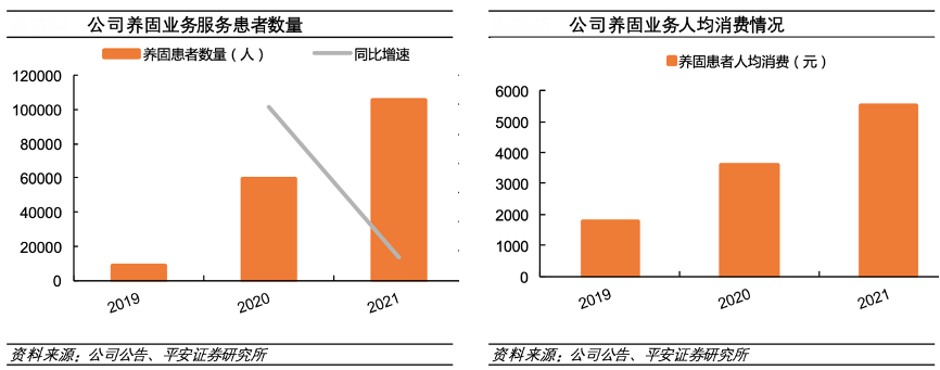 經典案例:根據公司公告、平安證券研究所等綜合資訊表明,雍禾醫療2021 年養固業務服務患者的數量達到10.5 萬人,增速達到 78%,患者人數快速增長。 同時公司養固業務人均消費不斷增加,2021年為 5531元,公司養固業務量價雙升。
