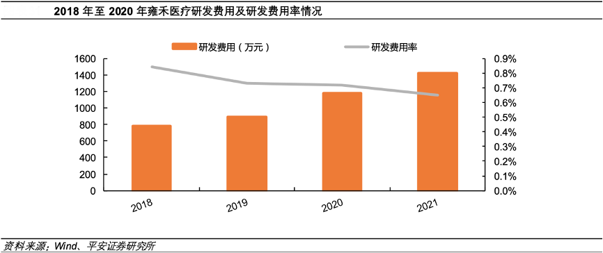 經(jīng)典案例:根據(jù)wind、天安證券研究所等綜合資訊表明,雍禾醫(yī)療公司的 LATTICE 點(diǎn)陣加密技術(shù),是針對(duì)天生頭發(fā)稀疏,發(fā)質(zhì)細(xì)軟,因脫發(fā)導(dǎo)致頭頂頭發(fā)稀疏等情況研發(fā)出的植發(fā)技術(shù),做到對(duì)原有頭發(fā)的“0”損傷。2018 年至 2021 年,公司的研發(fā)費(fèi)用(781/887/1181/1416 萬(wàn)元)不斷增加,研發(fā)費(fèi)用率 ( 0. 84% / 0. 73%/ 0.72% /0. 65%)略有下滑穩(wěn)定。