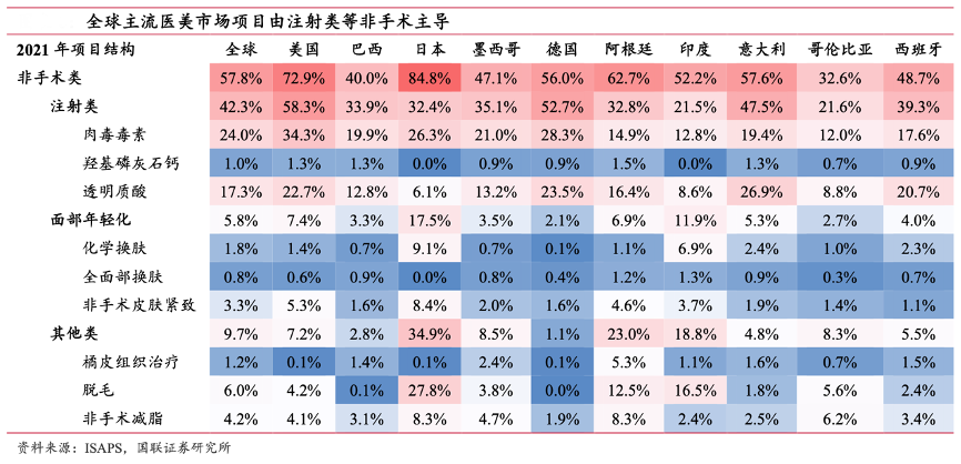 經典案例:根據ISAPS、國聯證券研究所等綜合資訊表明,全球主流醫美市場項目由注射類等非手術主導。ISAPS 數據顯示,2021 年全球主流醫美市場項目結構中,非手術類占比大多超過 50%,且非手術中以肉毒毒素、透明質酸為代表的注射類占比靠前。