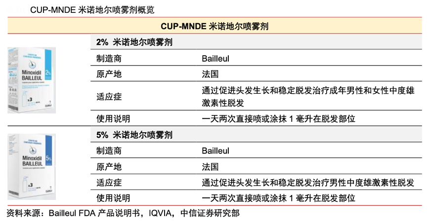 經(jīng)典案例:根據(jù)Bailleul FDA產(chǎn)品說明書、IQVIA、中信證券研究部等綜合資訊表明,目前市場(chǎng)中最暢銷的米諾地爾產(chǎn)品是三生制藥“蔓迪”,據(jù)三生制藥公司公告數(shù)據(jù),2022 年蔓迪實(shí)現(xiàn)銷售收入 8.91 億元, 同比+48.1%,市占率約 71.7%.米諾地爾為長(zhǎng)期日用藥品,CUP-MNDE 相較同類產(chǎn)品丙二醇含量低, 質(zhì)地更為清爽,具備競(jìng)爭(zhēng)力。