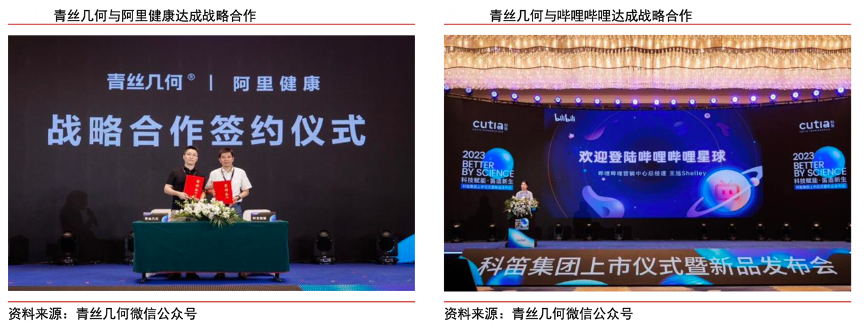 經(jīng)典案例:根據(jù)青絲幾何微信公眾號(hào)、中信證券研究部等綜合資訊表明,青絲幾何與京東健康、阿里健康、嗶哩嗶哩等達(dá)成戰(zhàn)略合作。2023 年 6 月 12 日,青絲幾何與阿里健康達(dá)成戰(zhàn)略合作,雙方將共同深化行業(yè)洞察、新品共創(chuàng)、精準(zhǔn)化場(chǎng)景營(yíng)銷、共建“營(yíng)銷+運(yùn)營(yíng)+供應(yīng)鏈+互聯(lián)網(wǎng)醫(yī)院+私域場(chǎng)域”一體化數(shù)字服務(wù)體系;同日,青絲幾何與嗶哩嗶哩達(dá)成戰(zhàn)略合作,品牌未來將從線上、線下數(shù)字化內(nèi)容營(yíng)銷賦能及 IP 共建等多維度,用趣味科普的方式,推動(dòng)年輕人對(duì)頭發(fā)及頭皮的科學(xué)認(rèn)知,提前預(yù)防、對(duì)癥解決頭發(fā)及頭皮問題。